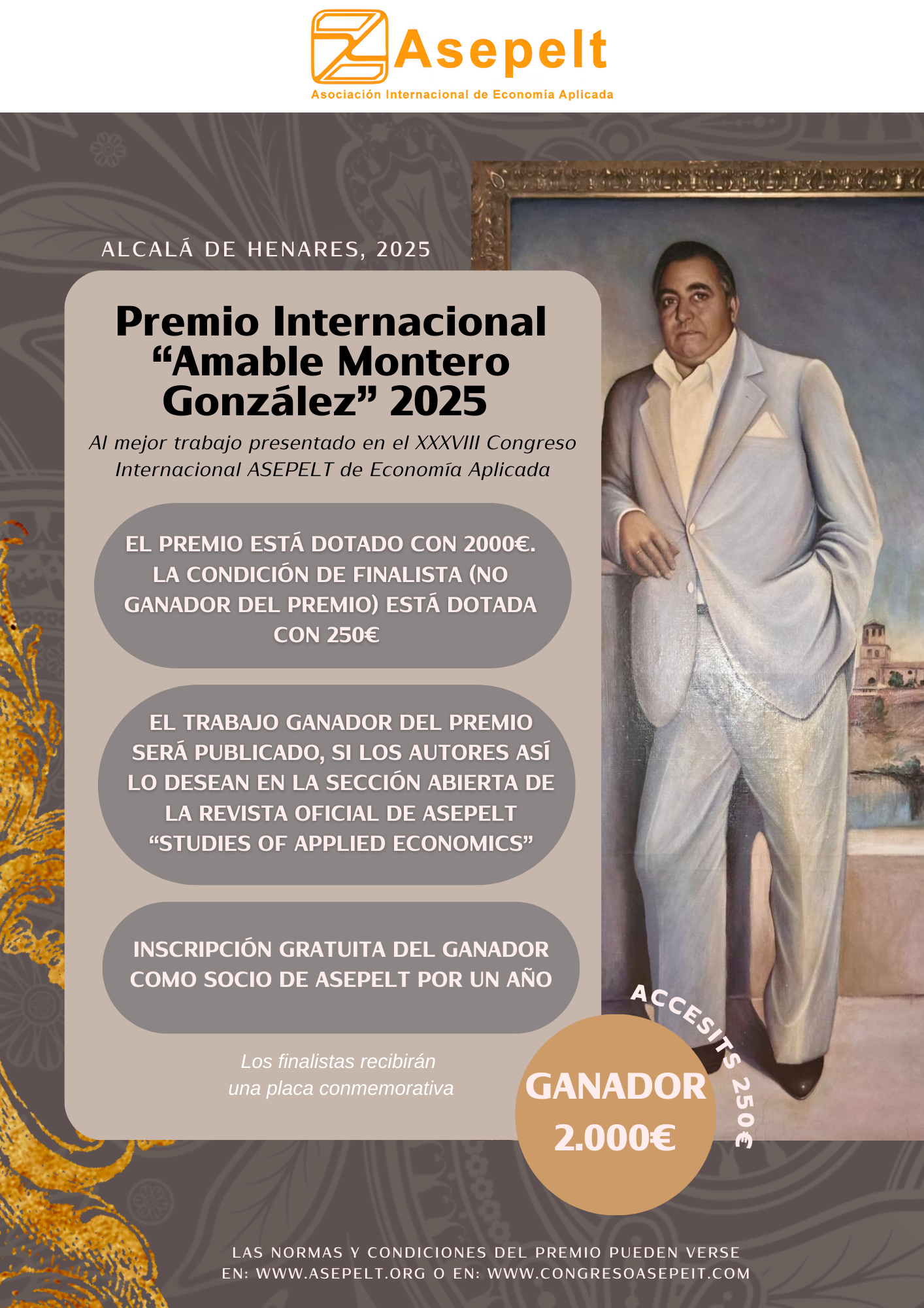 6. El Premio se acreditará con el correspondiente Diploma, que será entregado en la misma Cena de Gala. El trabajo ganador se publicará, SI ASÍ LO DESEAN LOS AUTORES, en la Revista Studies of Applied Economics. Asimismo, los autores del trabajo ganador serán inscritos gratuitamente como socios de ASEPELT por un año.